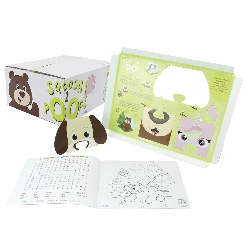 Experience the magic of unboxing like never before! You’ll be amazed at how we packed this giant plush into such a compact box until you see it for yourself. Our three-step poof-proof method ensures your jumbo plush reaches its full "poof-tential" once you take it out of the box! All you need is a dryer or a warm sunny spot to help it fluff up. While you wait for your Sqoosh 2 to fully poof, enjoy fun activities, including a coloring booklet featuring a word find and interactive cutout face masks.
